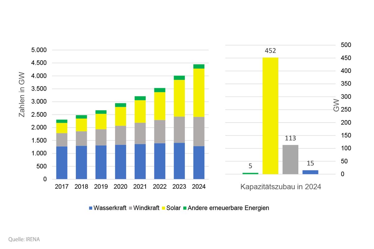 Mit einer Zuwachsrate von 32% ist steht PV für den größten Zuwachs unter den erneuerbaren Energien weltweit unter 2024.