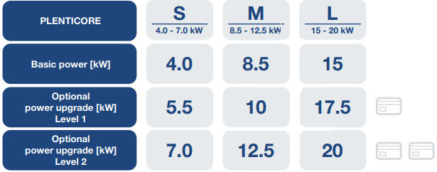 Der er fire nye effektklasser i det øverste segment: 12,5 kW, 15 kW, 17,5 kW og 20 kW. I alt kan følgende effektniveauer realiseres fra basisapparatet og ved brug af en eller to PLENTICOINs: