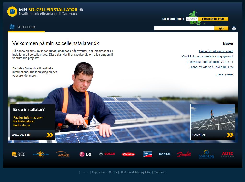 Brugervenlig, målgruppeorienteret og fyldt med informationer: Med www.min-solcelleinstallatør.dk har vi lanceret en ny website, som er lavet især til slutkunder. Siden byder på mange informationer rundt omkring emnet solceller. Ved at indtaste deres postnummer har kunderne derudover mulighed for at søge efter en passende håndværker i deres lokalområde. Ved hjælp af forskellige interaktive moduler kan en udbytteprognose til solcelleprojektet udarbejdes og rentabiliteten beregnes. Du kan vælge mellem 3 forskellige veje for at få et tilbud. Og som altid: De kunde-kontakter, som vi får gennem min-solcelleinstallatør, sender vi videre til vores håndværkspartnere. På den nye online-platform finder du derudover vores PV-animation ”Energi fra lys – Funktionsmåde af et nettilsluttet solcelleanlæg”, der viser leveringen til nettet, egetforbruget og lastmanagement. Gå på www.min-solcelleinstallatør.dk og se den nye website.