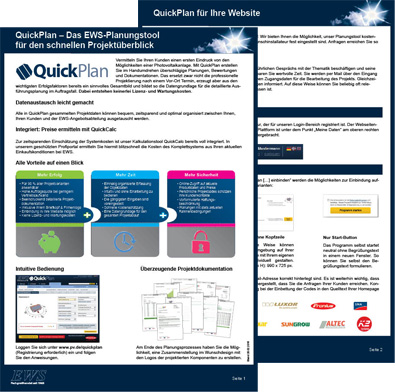 Mit einem neuen zweiseitigen Übersichtsblatt bringen wir Ihnen alle Vorteile des EWS-Planungstools näher – kurz, kompakt und bebildert. Lernen Sie die wichtigsten Vorzüge des Programms kennen und erfahren Sie, wie Sie QuickPlan auch kostenfrei auf Ihrer Website einbauen können. Anfragen erreichen Sie so direkt und ohne Umweg.