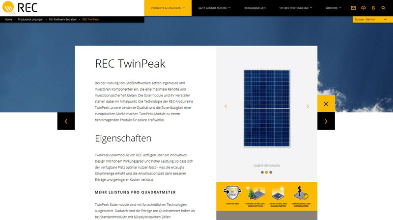 Besondere Hingucker sind die vielen informativen Videos, welche die Grundlagen der Photovoltaik näherbringen, sowie insbesondere auch das neue deutschsprachige TwinPeak-Video für einen Einblick in die innovative Modulserie im Halbzellendesign. Überzeugen Sie sich selbst!