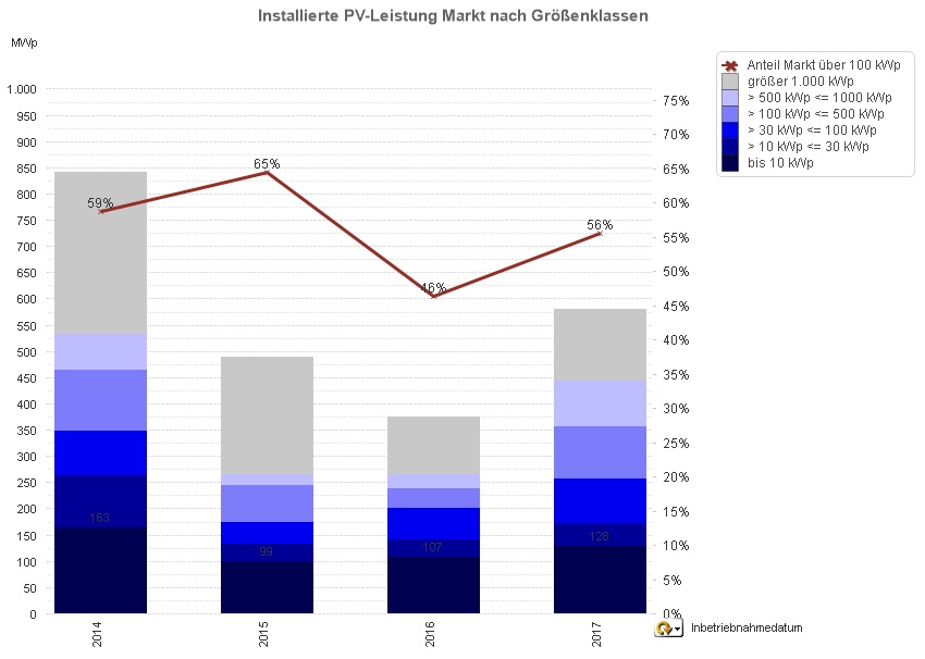 Tatsächlich im Mai installiert wurden Anlagen mit einer Leistung von 154,091 MWp. Das Distributionsgeschäft, welches die Anlagensegmente bis 100 kWp beinhaltet, verharrt auf dem Niveau der Vormonate. Im Jahresvergleich war der Marktanteil kleinerer Anlagen (bis 100 kWp) deutlich geringer als 2016, aber wesentlich höher als beispielsweise 2014 und 2015 (siehe Grafik rechts).