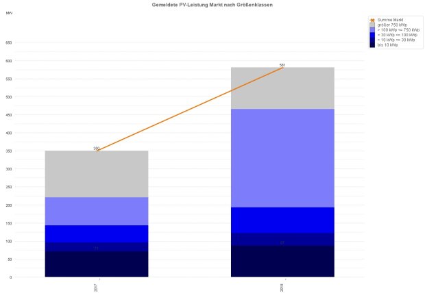 - Positiv entwickelten sich die Größenklassen unter 100 kWp: Mit 193 MWp ist 35 % mehr Anlagenleistung ans Netz gegangen als in Q1/2017 (143 MWp).