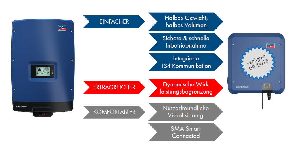 - Einfacher: Dank eines Gewichts von nur 17 kg und des kompakteren Designs lässt sich der Sunny Tripower platzsparend und schnell durch eine Person installieren. Die Inbetriebnahme erfolgt über die integrierte Weboberfläche sicher und zeitsparend per Smartphone oder Tablet. Für besondere Anforderungen auf dem Dach, z. B. bei Verschattungen, lassen sich die Moduloptimierer TS4-R unkompliziert und passgenau hinzufügen – hierfür sorgt die ebenfalls integrierte TS4-Kommunikation.