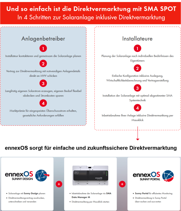 Mit der Novelle des Erneuerbare-Energien-Gesetzes (EEG) 2016 wurde die Direktvermarktung von Strom aus PV-Neuanlagen mit einer Leistung ab 100 kWp verpflichtend eingeführt. Neben den Kosten für die Anlagenausstattung mit entsprechender Fernwirktechnik stellt die Wahl eines passenden Dienstleisters für den Energiehandel jedoch häufig ein Hindernis dar. Mit den SMA Lösungen für gewerbliche Anlagen wird die wirtschaftliche Marktintegration jetzt ganz einfach möglich, denn sie beinhalten auf Basis der neuen Energiemanagement-Plattform ennexOS bereits alle technologischen Komponenten, die für den automatisierten digitalen Energiehandel nötig sind. Die MVV übernimmt dann durch abgestimmte Schnittstellen und Prozesse die komplette Abwicklung zur Einbindung in den Strommarkt.