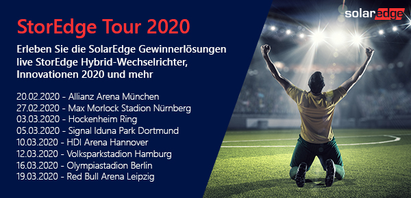 Mit einer Stadion-Tour durch Deutschland stellt SolarEgde im Februar und März seinen neuen dreiphasigen StorEdge Wechselrichter intensiv vor. An acht Terminen, in exklusiven Locations, wird ein einzigartiger Mix aus Innovationsschau und technischem Training angeboten. Neben Trends und Trainingsinhalten wird die Installation des Wechselrichters mit Batterie sowie die Konfiguration des Systems live gezeigt.