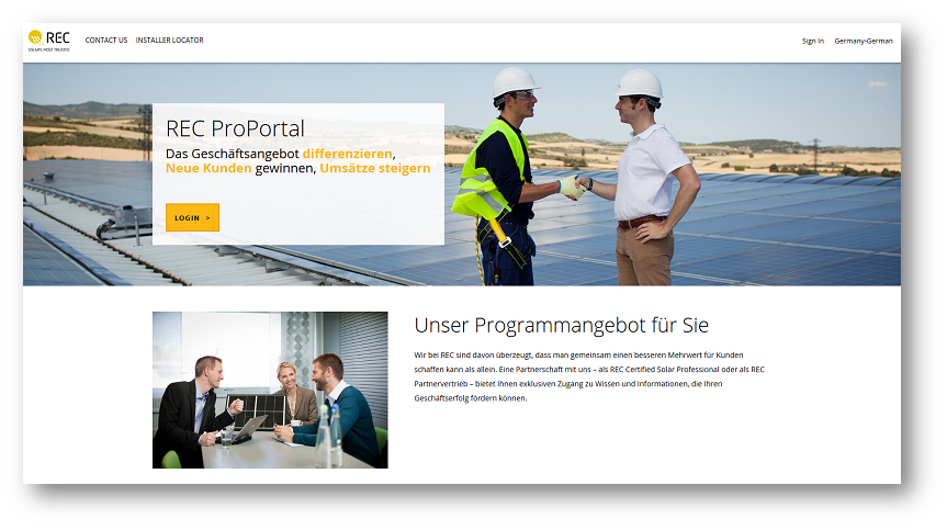 Um die Vorteile des ProPortals mit den o. g. Diensten und Tools nutzen zu können, ist eine kurze Registrierung erforderlich. Hierzu hat REC Anfang Juli bereits alle Solar Professionals per E-Mail eingeladen.