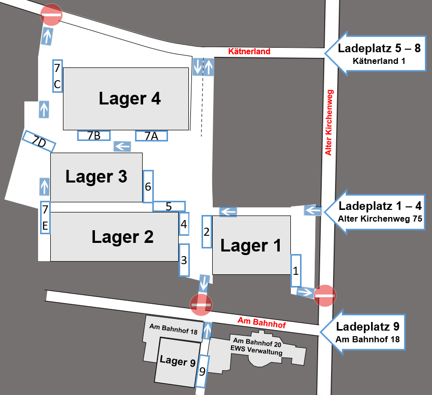 Auf dem aktuellen EWS Transportleitplan sieht man deutlich die zusätzlichen Zufahrten von der Straße Kätnerland 1, sowie die neuen sechs von insgesamt zwölf LKW-Ladeplätzen auf dem fast drei Hektar großen Betriebsgelände.