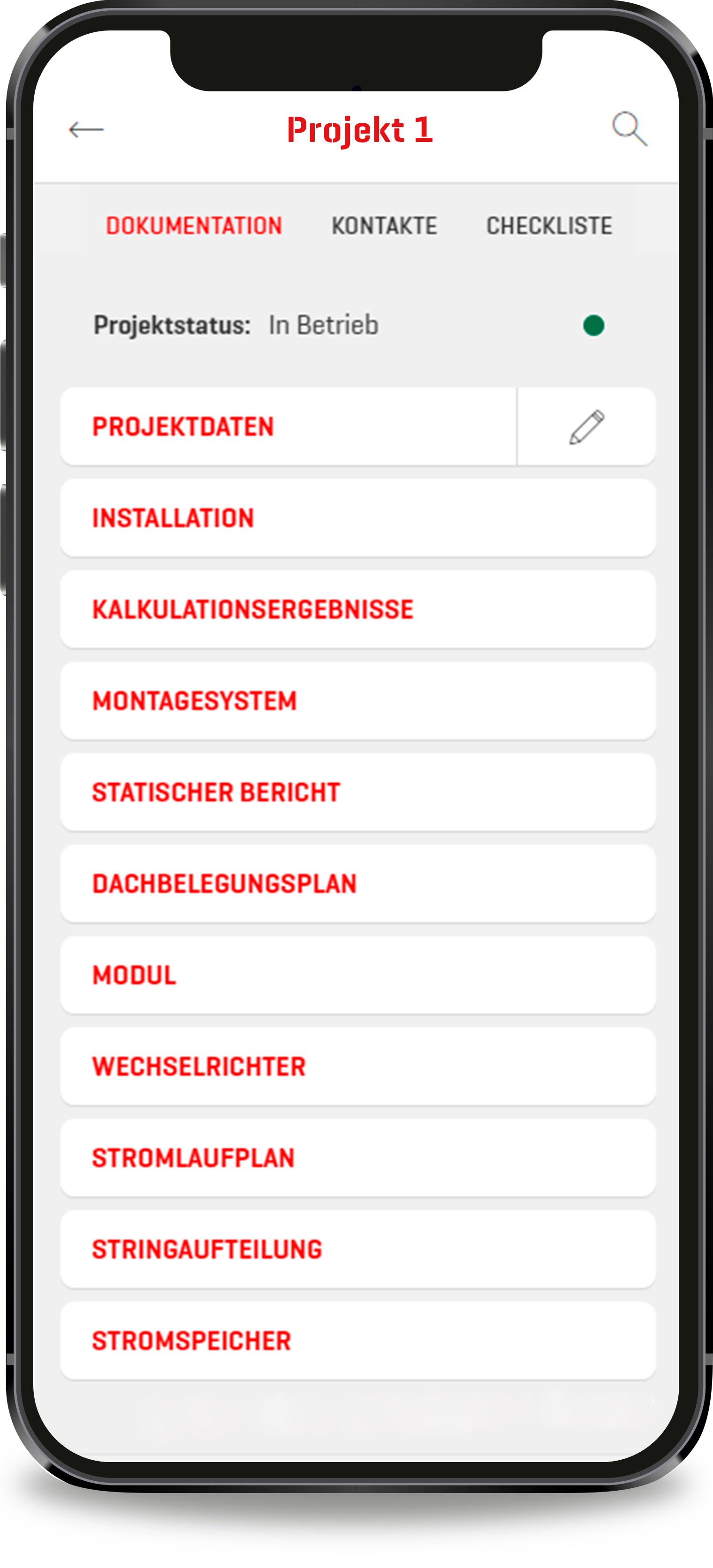 Hinterlegung und Verwaltung aller für das Projekt relevanten Daten: Projekt-, Installations- und Kundendaten. In ihrem Smartphone gespeicherte Kontaktdaten können beispielsweise einfach übernommen werden.- Upload aller für die Dokumentation erforderlichen Papiere, u.a. Berichte, Datenblätter und Zertifikate der verwendeten (Module, Speicher, Wechselrichter etc.), statische Pläne, Installationsfotos sowie Belegungs- und Stromlaufpläne. Für diesen Upload kann die K2 DocuApp auch über den Browser am PC (als Web-App) geöffnet und verwaltet werden. Daten zum Montagesystem sind automatisch durch den Datenimport aus K2 Base integriert.