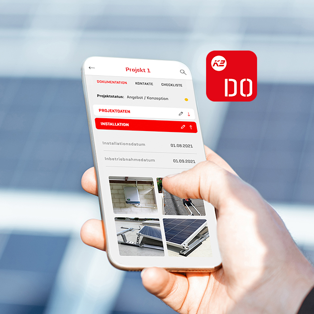 Sie reiht sich in die bereits vorhandenen digitalen Lösungen unseres Partners ein: Nutzen Sie die K2 Check App zur Erfassung der Projektdaten auf dem Dach, planen Sie in K2 Base und erledigen Sie Projektdokumentation in der DocuApp – die Übernahme bzw. Übergabe der Daten funktioniert dabei nahtlos! Installateure mit K2-Benutzerkonto melden sich einfach mit Ihren Zugangsdaten aus K2 Base an, alle anderen nutzen die kostenlose Neuregistrierung. Für Ihren Start mit der K2 DocuApp steht ein Probepaket von fünf Dokumentationen bereit, so dass Sie ausführlich testen und dokumentieren können. Danach ist die App kostenpflichtig und es wird pro Dokumentation abgerechnet. Alle weiteren Infos hierzu finden Sie auf der K2 Website.
