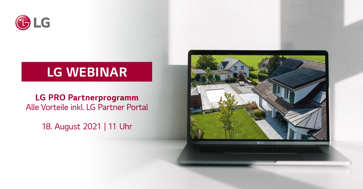 Zum Auftakt am 18. August 2021 präsentiert Ihnen Stephan Ostermann, Sales Manager bei LG Electronics, das LG PRO Partnerprogramm. Durch die Mitgliedschaft profitieren Installateure neben der Wissensvermittlung (z. B. in Form von Schulungen) von umfangreichen Vorteilen der starken Marke LG.