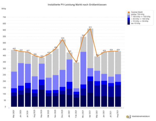 Die Bundesnetzagentur hat die Zubauzahlen für August 2021 veröffentlicht: Hiernach wurden PV-Anlagen mit einer Leistung von 434,505 MWp neu im Marktstammdatenregister gemeldet.
