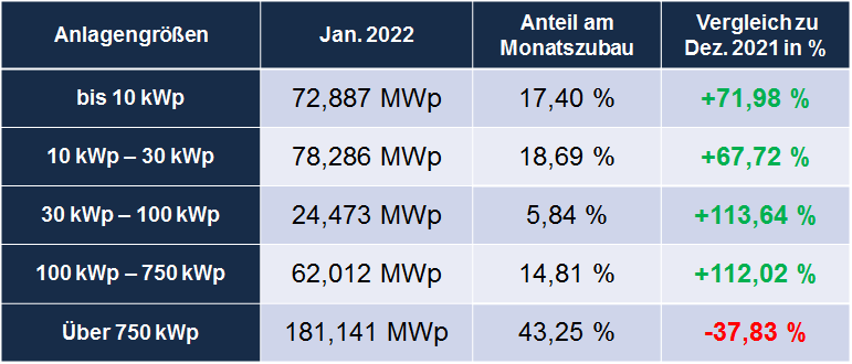 Stärkstes Segment wie schon im Dezember 2021 ist erneut die Klasse der Anlagen über 750 kWp, allerdings mit wesentlich geringerem Abstand zu den weiteren Anlagenklassen. Im Vormonat hatte es noch zwei Drittel der Gesamtleistung auf sich vereint, nun sind es noch gut 40 Prozent. Alle weiteren Segmente haben im Vergleich zu Dezember wieder deutlich zugelegt und nähern sich dem bisher bekannten Niveau wieder an.
