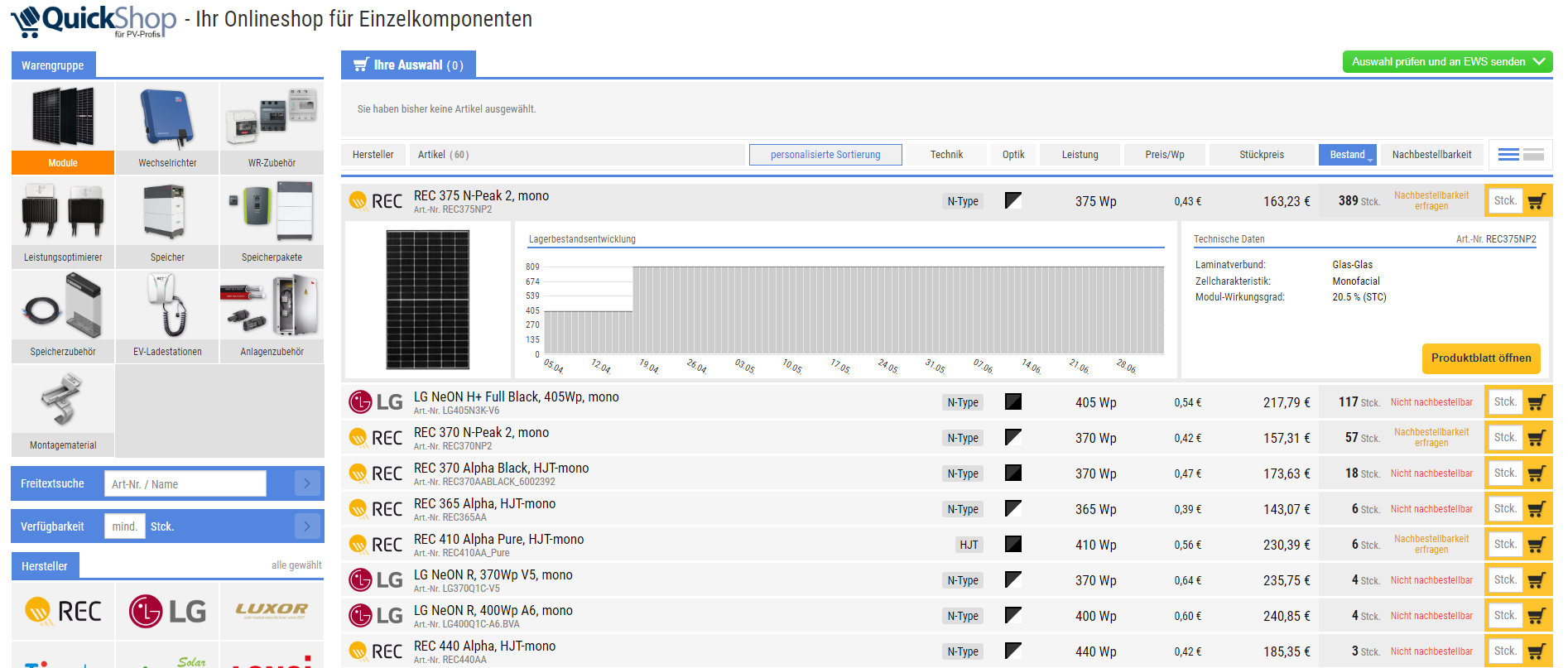 Neben Standards wie Produkteigenschaften, Preis und Lagerbestand erhalten PV-Profis eine Übersicht über die Verfügbarkeit aller Produkte in den kommenden Monaten und die Möglichkeit für eine Nachbestellung über den bestehenden Vorlauf hinaus.