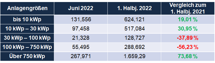 Dies ist noch einmal eine leichte Verbesserung zum Vormonat (Mai 2022: 548,022 MWp – wir berichteten) und ein sattes Plus von fast 150 MWp im Vergleich zum Juni 2021.