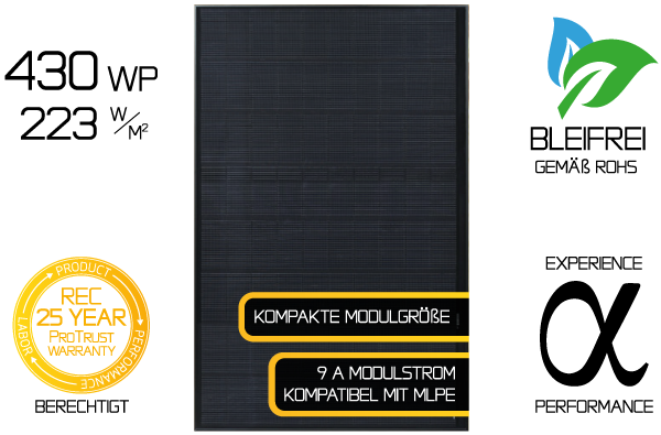 Mit Heterojunction-Zellen (HJT) im großen G12-Format in einem patentierten Moduldesign liefert das REC Alpha Pure-R eine Leistung von bis zu 430 Wp. Dabei bleibt es unter der „Schallgrenze“ von zwei Quadratmetern Fläche und eignet sich deshalb auch für Installationen auf Wohngebäuden mit begrenztem Platzangebot.