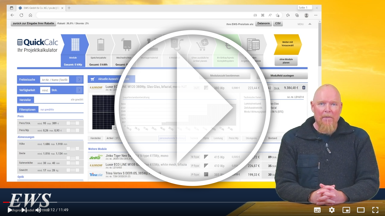In einem kompakten Video stellt der Leiter der Softwareentwicklung bei EWS Hagen Ermer dar, wie QuickCalc 3.0 die Einkaufsprozesse von PV-Installationsbetrieben unterstützen kann. Dabei bilden neben den Auswahl- und Filterfunktionen vor allem die Darstellungen zur Produktverfügbarkeit im Zeitverlauf den Fokus. Als Großhandel bietet EWS seinen Kundinnen und Kunden so eine bisher unerreichte Planungssicherheit mit bis zu sechs Monaten Vorlauf und damit die größtmögliche Verbindlichkeit in diesem Teil der Lieferkette. Selbstverständlich können im neuen Systemkalkulator von EWS auch alle Details zur Versandlogistik vereinbart werden, z. B. die Lieferung zum Wunschtermin direkt auf die Baustelle oder die individuelle Berechnung der Frachtkosten.
