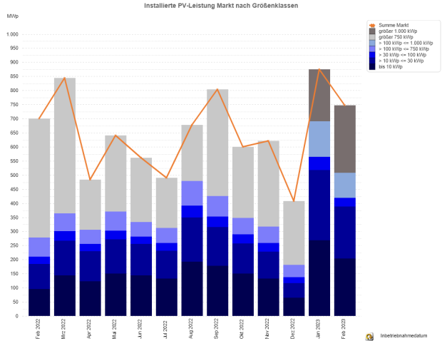 Die Bundesnetzagentur hat die Photovoltaik-Zubauzahlen für den Monat Februar 2023 bekanntgegeben: Hiernach wurden Anlagen mit einer Leistung von 745,9 MWp neu im Marktstammdatenregister angemeldet.