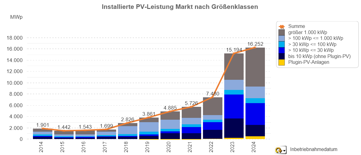 Photovoltaik-Zubau in Deutschland nach Größenklassen (2014 - 2024)