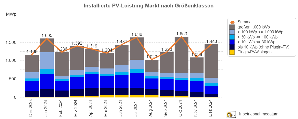 Geprägt wird der Zubau im Dezember 2024 von dem hohen Anteil der Großanlagen (über 1 MWp), auf den gut zwei Drittel der registrierten Leistung (907,4 MWp) entfallen. Die übrigen Anlagensegmente bleiben mit ca. 536 MWp hinter den Ergebnissen der vergangenen 12 Monate zurück. Besonders ausgeprägt ist der Abwärtstrend im Eigenheimbereich. Hier steht ein Minus von bis zu 50 % im Vergleich zum Vorjahreswert (Dezember 2023) zu Buche. Auch der Boom im Selbstbausegment scheint vorbei zu sein. Das Potential für hochwertige Plugin-PV-Anlagen, die im Rahmen einer individuellen Beratung vom versierten Profi verkauft werden, dürfte aber weiter riesig sein.