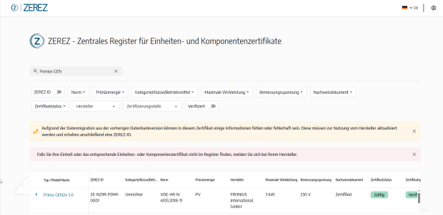 Registrierte Einheiten- und Komponentenzertifikate bekommen eine sogenannte ZEREZ-ID, welche ab dem 1. Februar 2025 beim Betriebserlaubnisantrag beim Netzbetreiber abgefragt wird. Die ZEREZ-ID ist jederzeit ohne Anmeldung auf der Webseite des Registers abrufbar.