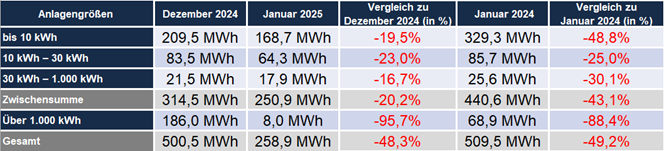 Schon im Vorjahr machte sich ein Abwärtstrend im Zubau von Speicherkapazitäten bemerkbar – im Vergleich zum Januar 2024 hat sich die installierte Kapazität beinahe halbiert. Auch die Anmeldung neuer Großspeicher (über 1.000 kWh) ist vom Abwärtstrend stark betroffen und bleibt im Januar weit hinter den Vormonaten zurück.