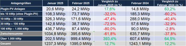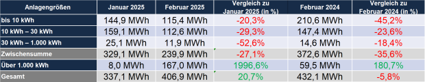 Nachdem im Januar 2025 überdurchschnittlich viele Dachanlagen aus dem Vorjahr nachgemeldet worden waren, um 21. Jahr der Vergütung zu sichern, liegt der Zubau bei Anlagen unter 1.000 kWp im Februar ca. 40 % unter dem Vorjahreswert und deutlich unter dem Januar. Vielen spezialisierten PV-Fachbetrieben, die im Boomjahr 2023 ihr Team verstärkt hatten, steht das Wasser mittlerweile bis zum Hals. Insolvenzen und Zahlungsausfälle sind weiter an der Tagesordnung.