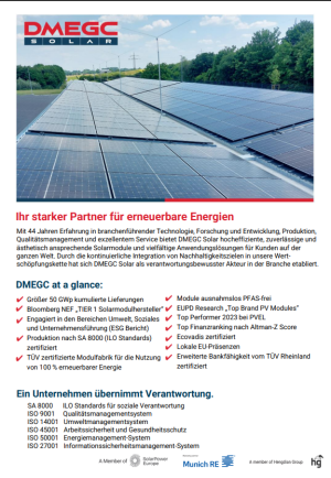 DMEGC Solar zählt zu den weltweit führenden Modulherstellern. Das Unternehmen steht für hohe Fertigungstiefe, kontinuierliche Innovationskraft und exzellente Produktqualität. Als Teil der Hengdian Group greift DMEGC Solar auf eine starke Forschungs- und Entwicklungsbasis sowie eine robuste globale Infrastruktur zurück. Mit Niederlassungen, Logistikstandorten und technischen Servicezentren in über 80 Ländern bietet DMEGC Solar umfassende Kundennähe, Support und schnelle Reaktionszeiten.