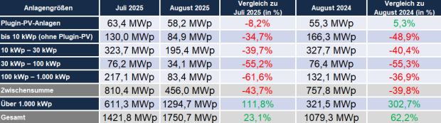 Der August zeigt also nicht nur ein saisonales Tief, sondern offenbart auch strukturelle Schwächen: Vorzieheffekte sorgen für starke Ausschläge, Impulse für Kleinanlagen und Speicher fehlen. Marktbelebende Faktoren wie Elektromobilität, Wärmepumpen und Eigenverbrauch bleiben zwar sehr attraktiv, müssen nur wieder mehr in das Bewusstsein potenzieller Anlagenbetreiber gebracht werden. Auch die Wirkung des Investitionsboosters auf die Bereitschaft zur Eigenstromversorgung im gewerblichen Bereich lässt weiter auf sich warten, obwohl die Rahmenbedingungen hier derzeit äußerst wirtschaftlich sind.