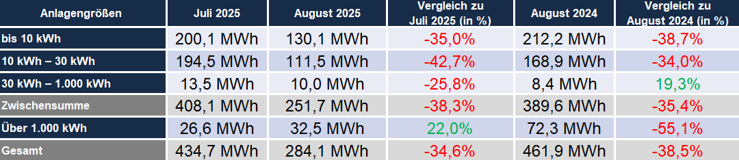 Der August liefert ein gespaltenes Bild: Während die Nachfrage nach privaten Dachanlagen und Heimspeichern auf ein historisches Tief fällt, setzen Großanlagen im Megawattbereich neue Höchstmarken. Die Absenkung der Einspeisevergütung verschob einen Teil der Nachfrage bereits in den Juli, sodass der August eine spürbare Nachfragedelle aufweist. Insgesamt spiegelt der Zubau damit einen Monat der Gegensätze wider – Flaute bei Kleinanlagen, Boom bei Großprojekten.