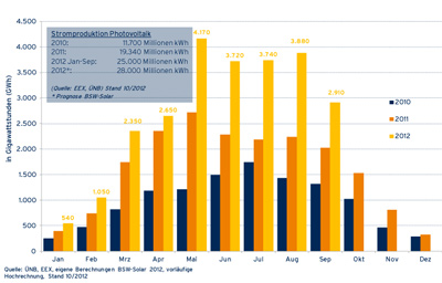 Solarstrom gewinnt in Deutschland als Energiequelle weiter an Relevanz: Im Vergleich zum Vorjahreszeitraum (Januar bis September 2011) ist die Produktion auf 25 Mrd. kWh gewachsen. Dies entspricht einer Produktionssteigerung von 50 %. Ende August 2012 waren in Deutschland bereits 30 GWp Solarstromleistung installiert (rund 1,2 Mio. PV-Anlagen). Der Gesamtanteil am deutschen Strommix lag dabei bei mehr als sechs Prozent. Die Photovoltaik hat damit die Biomasse überholt.