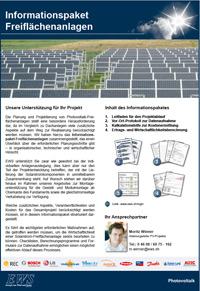 Bei der Planung und Umsetzung von Freiflächenanlagen müssen andere technische, wirtschaftliche und gesetzliche Rahmenbedingungen berücksichtigt werden als bei Dachanlagen. Damit Sie optimal auf eventuelle Anfragen vorbereitet sind, haben wir ein EWS-Freiflächenpaket erarbeitet. Dieses enthält neben einem Vor-Ort-Protokoll und einem Leitfaden zur Weitergabe an Ihren Kunden auch zwei Kalkulationstools, mit denen sich Kosten und Rentabilität berechnen lassen. Das Infoblatt mit allen Details zum Paket und unseren Leistungen finden Sie unten im Download, alle Materialien stehen in unserem Partnerbereich für Sie bereit. Bei Fragen wenden Sie sich gern an: