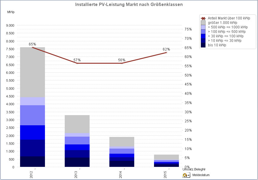 In den ersten sieben Monaten des laufenden Jahres wurden ca. 787 MWp zugebaut. Im Vergleichszeitraum des Vorjahres waren es noch 1.359 MWp – ein Einbruch um 42 %. Somit lag die Summe der neu installierten PV-Anlagen mit ca. 1,860 GWp in den vergangenen 12 Monaten (Juni 2014 bis Juli 2015) deutlich unter dem politisch angestrebten Zubaukorridor von 2,4 bis 2,6 Gigawatt.