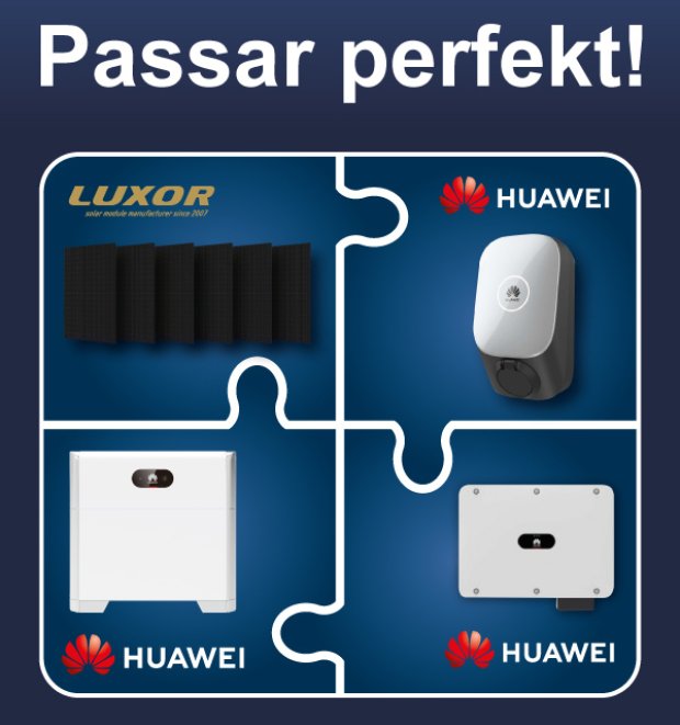 Länk: Produktdatablad / Länk: Produktwebbsida - Drömteamet för effektiv lagring av solel är kombinationen av Huawei SUN2000-10KTL-M1 - 13,5 A och solelbatteriet Huawei LUNA2000-5-S0 (5 kWh). Den högeffektiva trefas- växelriktaren har en maximal verkningsgrad på 98,6% och kan leverera en full AC-effekt på 10 kW samt ladda batteriet med 10 kW. Högvoltbatteriet som bygger på litium-järnfosfat-celler kan tack vara sin modulära designen utökas från 5 till 30 kWh när som helst.